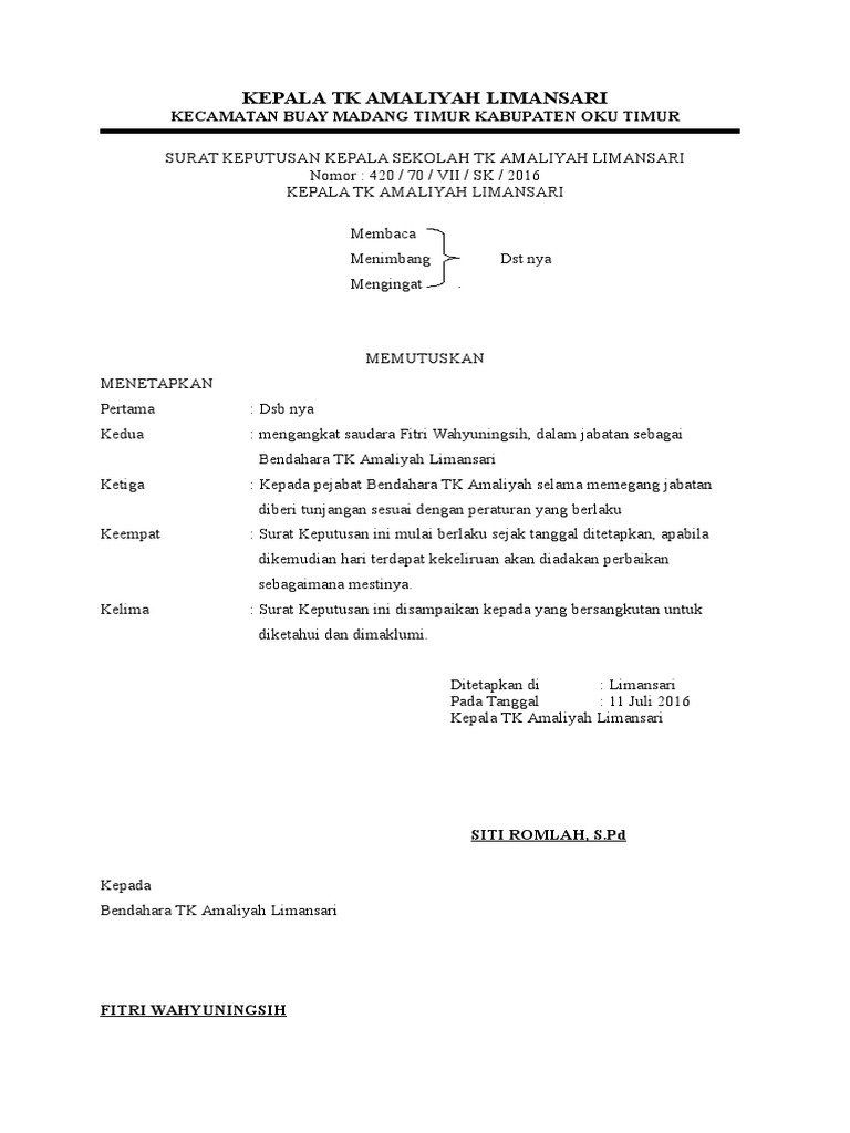 Bahwa berdasarkan pertimbangan sebagaimana dimaksud huruf a tersebut, dipandang perlu menetapkan keputusan kepala desa tentang pengangkatan tk kuncup selengkapnya: Share & embed sk bendahara desa 2020. Contoh sk tim bos sekolah 2019 2020 file doc dapodikdasmen net. Pada postingan saat ini admin akan. Contoh surat sk bendahara sekolah guru paud dari kepala desa doc dapatkan tk pengangkatan pkbm dunia sosial.